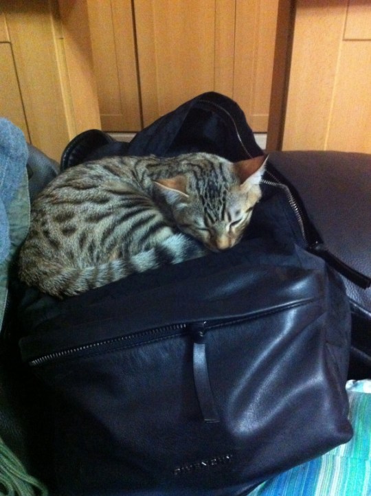 Digo que papá se va, entonces el hijo Dadoong se pone a dormir en mi bolsa.. No debería irme ahora.. Pero tengo que seguir mi programa ke ke